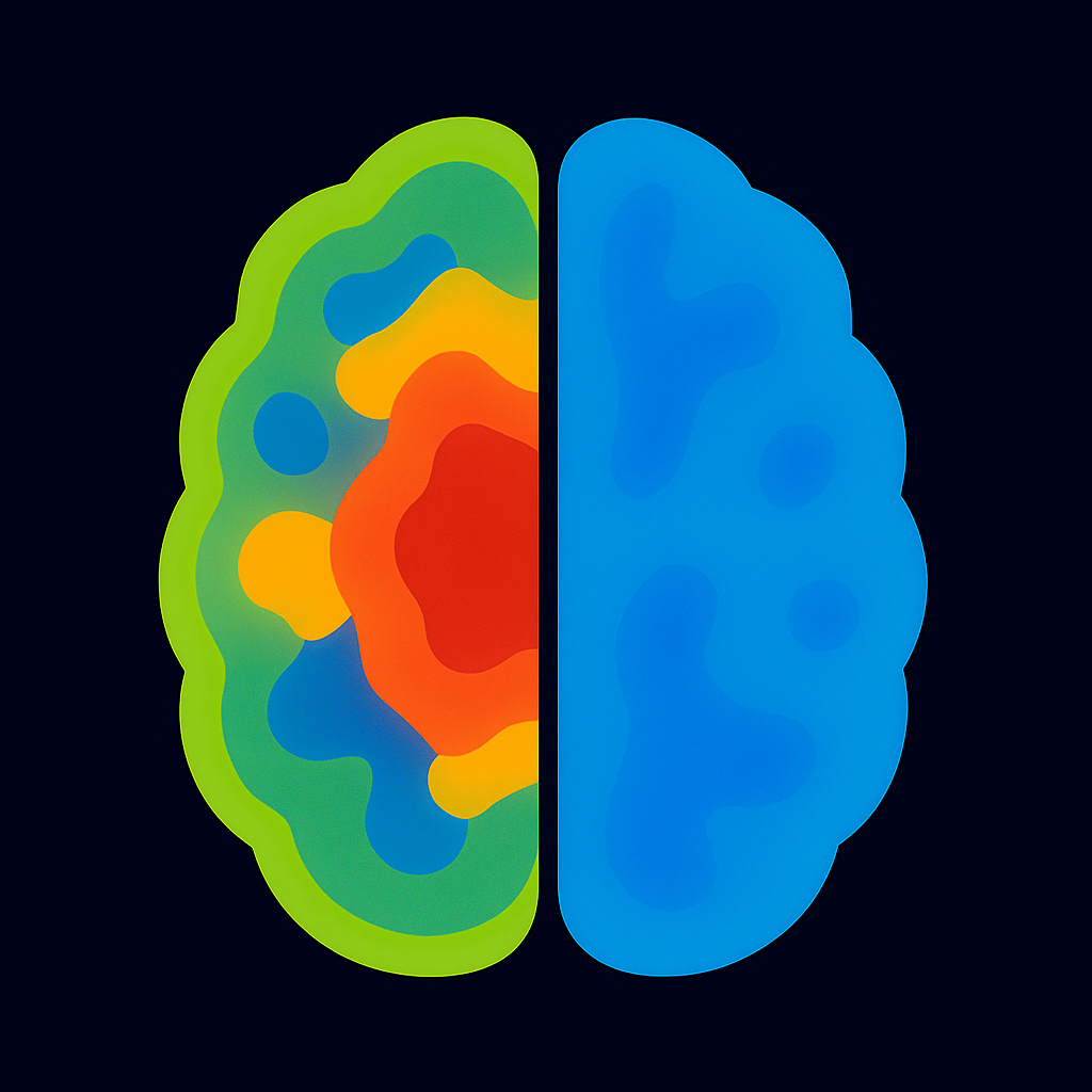 On the left, stress, overstimulation, and scattered energy light up the brain in reds and yellows. On the right, calm clarity takes over — cool blues showing focus, balance, and steady energy. Rhove helps you shift from chaos to control with natural adaptogens that keep your mind clear and your body energized
